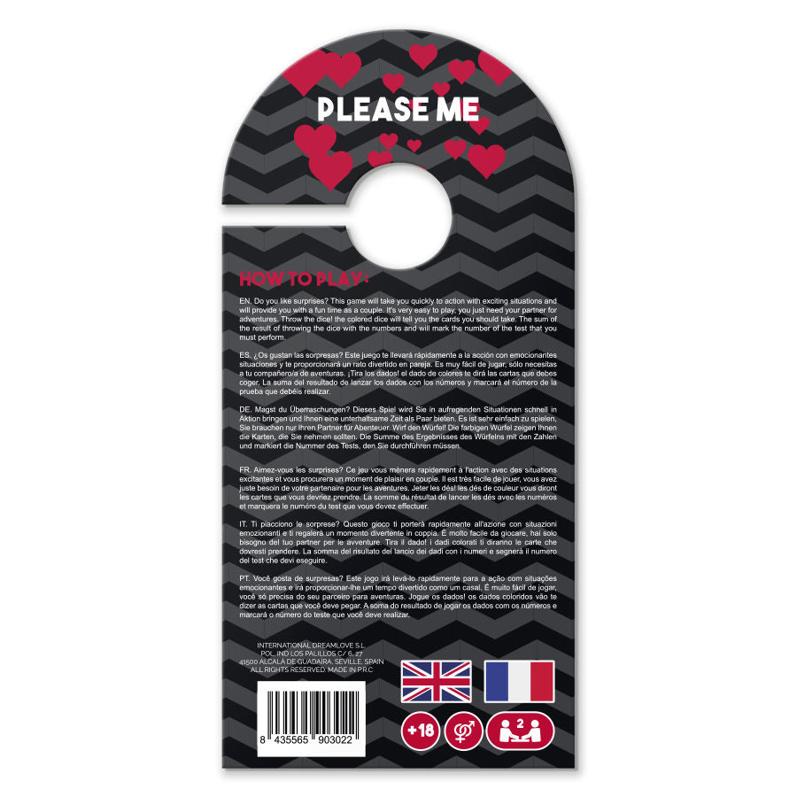 Do you like surprises? This game will quickly get you into action with exciting situations and will give you fun moments as a couple. It is very easy to play, you just need your adventure partner. Roll the dice! The colored dice will tell you the cards you should take. The sum of the result of the dice roll with the numbers and will mark the number of the test you have to throw.