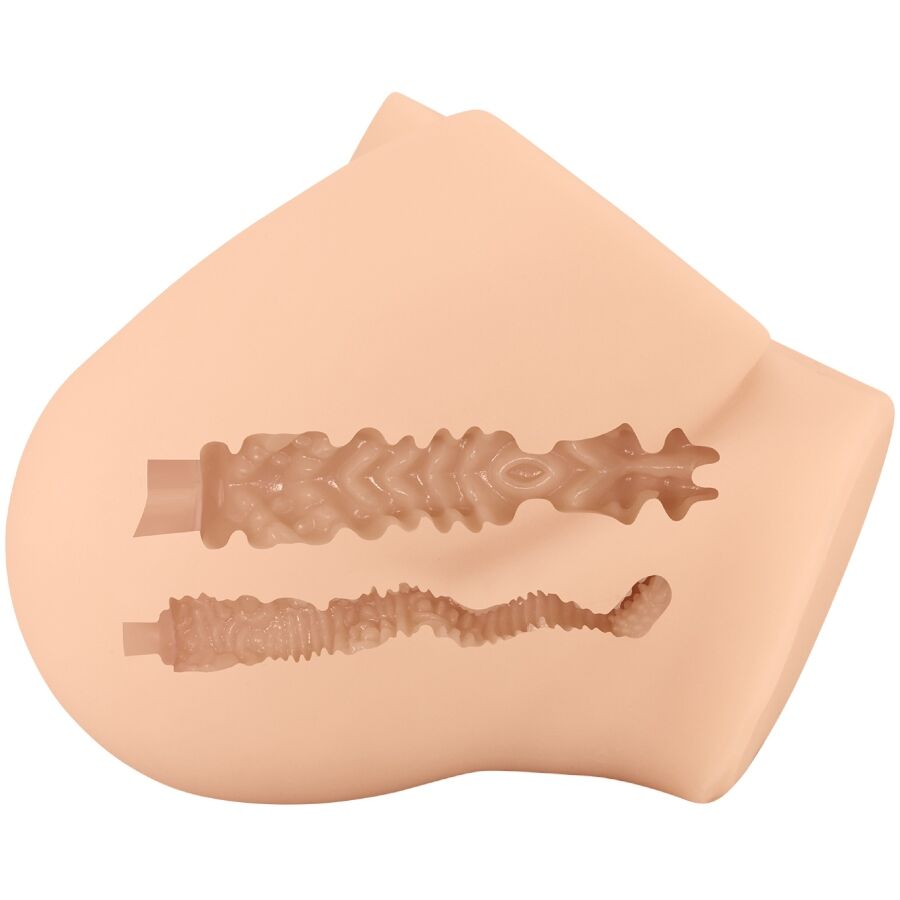 Grab, squeeze, caress, and spank this realistic Butt and Vagina Masturbator. This super-tight, two-hole sex toy offers the perfect, pleasure-filled experience. Slide deep into her tight ass and realistic pussy as you slide into her intricately textured tunnel. Thin ribs and stimulating nubs surround your cock as you stroke back and forth. Her tight pussy and peach-colored ass are just waiting to be filled, for night after night of satisfaction.