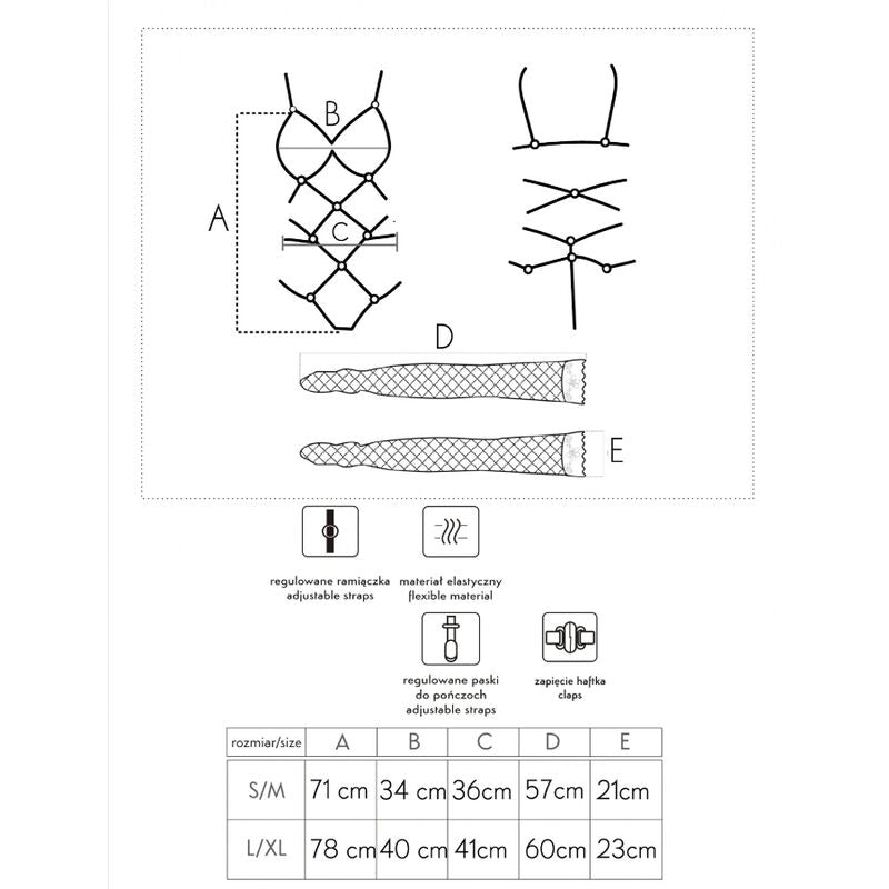 The upper part of the set consists of sexy black stripes, intertwined on the belly and connected by rings. The straps in the upper part elegantly envelop the bust without covering it, while in the lower part they smoothly transform into a thong. Individual straps run along both sides of the thong, charmingly hugging the hips. The lower part of the set consists of black stockings of adjustable length, made of mesh. The stockings are fastened with clips to the upper element of the outfit, in the front and back.