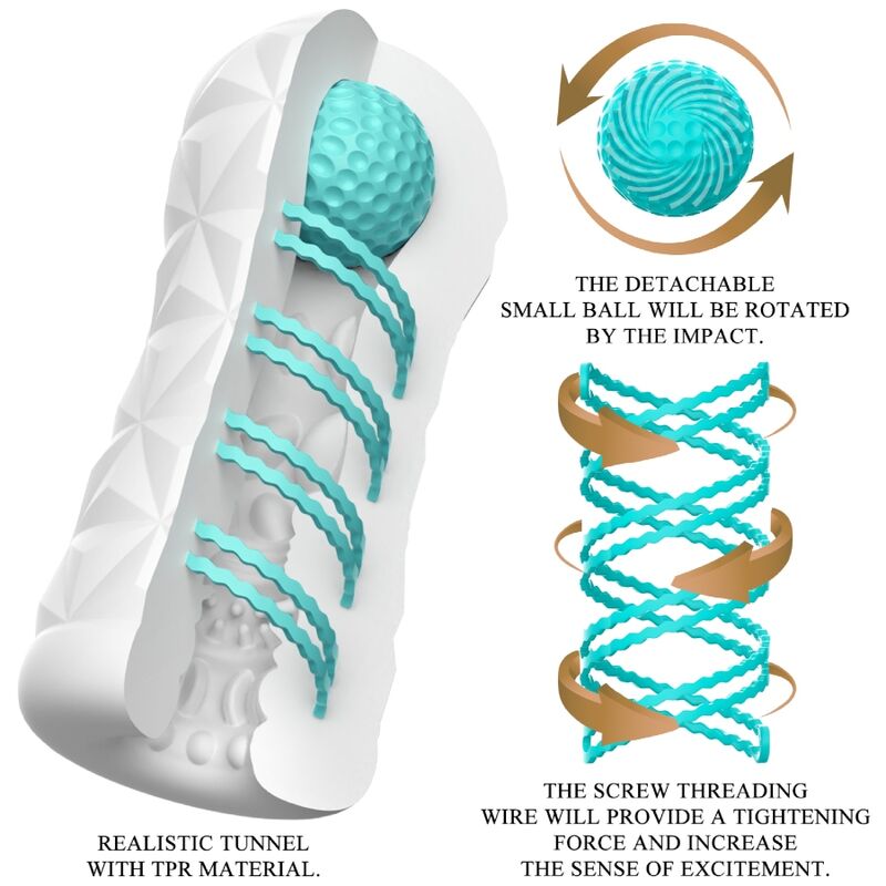 Small tool for giant masturbation fun! This transparent and reusable masturbator has a rotating spiral and a stimulation ball on the side, the rotating spiral makes the masturbator rotate during penetration and the ball on the top can stimulate the right spot and give you a new sensation. The sleeve has a stimulating and exciting texture inside that intensely and dynamically massages the penis during manual work. You can use this elegant skin-friendly masturbator again and again. Very easy to use and pure pleasure!